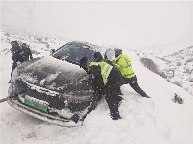 次日上午,業(yè)拉山路段一輛面包車因打滑深陷路邊溝谷,車內(nèi)兒童被凍得哭鬧不止,孩子母親急得直掉眼淚。民警吳紹軍見(jiàn)狀,立即脫下自己的警用大衣裹住孩子,耐心安撫一家人的情緒,隨后背起孩童,深一腳淺一腳地在積雪中跋涉,將一家人安全轉(zhuǎn)移至溫暖區(qū)域。