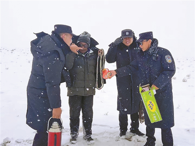 圖為嘎色(左一)和同事在風(fēng)雪中給群眾送去熱水和食物。圖/文 記者 王敏 通訊員 郭遠敬