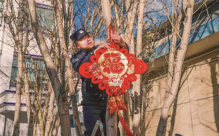 夜幕四合,一天的走訪慰問(wèn)與便民服務(wù)圓滿結(jié)束,派出所營(yíng)區(qū)里迎來(lái)了一場(chǎng)屬于邊關(guān)衛(wèi)士的新春“家宴”。“來(lái)來(lái)來(lái),搭把手!把中國(guó)結(jié)掛高點(diǎn),更顯喜慶!”教導(dǎo)員楊曦淙踩著凳子懸掛中國(guó)結(jié),新警吳措多杰在一旁穩(wěn)穩(wěn)扶著梯子;另一邊,民警們?nèi)宄扇海N春聯(lián)、掛彩燈,將營(yíng)區(qū)裝點(diǎn)得喜氣洋洋、年味十足。