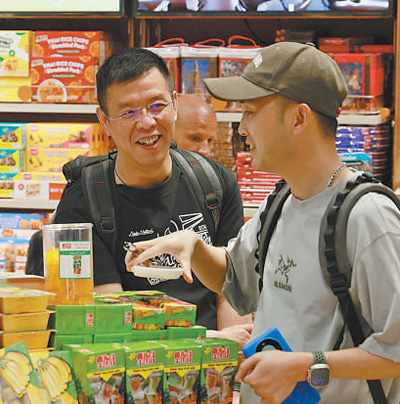 在泰國(guó)曼谷素萬那普機(jī)場(chǎng)免稅店,兩名中國(guó)游客正在購(gòu)買當(dāng)?shù)靥厣a(chǎn)品。本報(bào)記者 白元琪攝