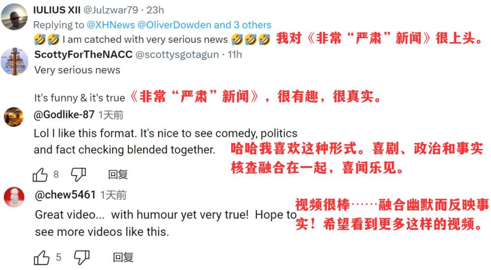 脫口秀播發(fā)后,英國議會議員喬治·加洛韋、倫敦廣播公司主持人丹尼絲·黑德利、倫敦都市大學(xué)副教授康斯坦丁諾斯·皮塔基、美國反戰(zhàn)組織“粉色代碼”等機構(gòu)和個人賬號紛紛轉(zhuǎn)贊評。網(wǎng)友們在評論區(qū)呼吁:這樣有趣又有料的節(jié)目,多多益善!