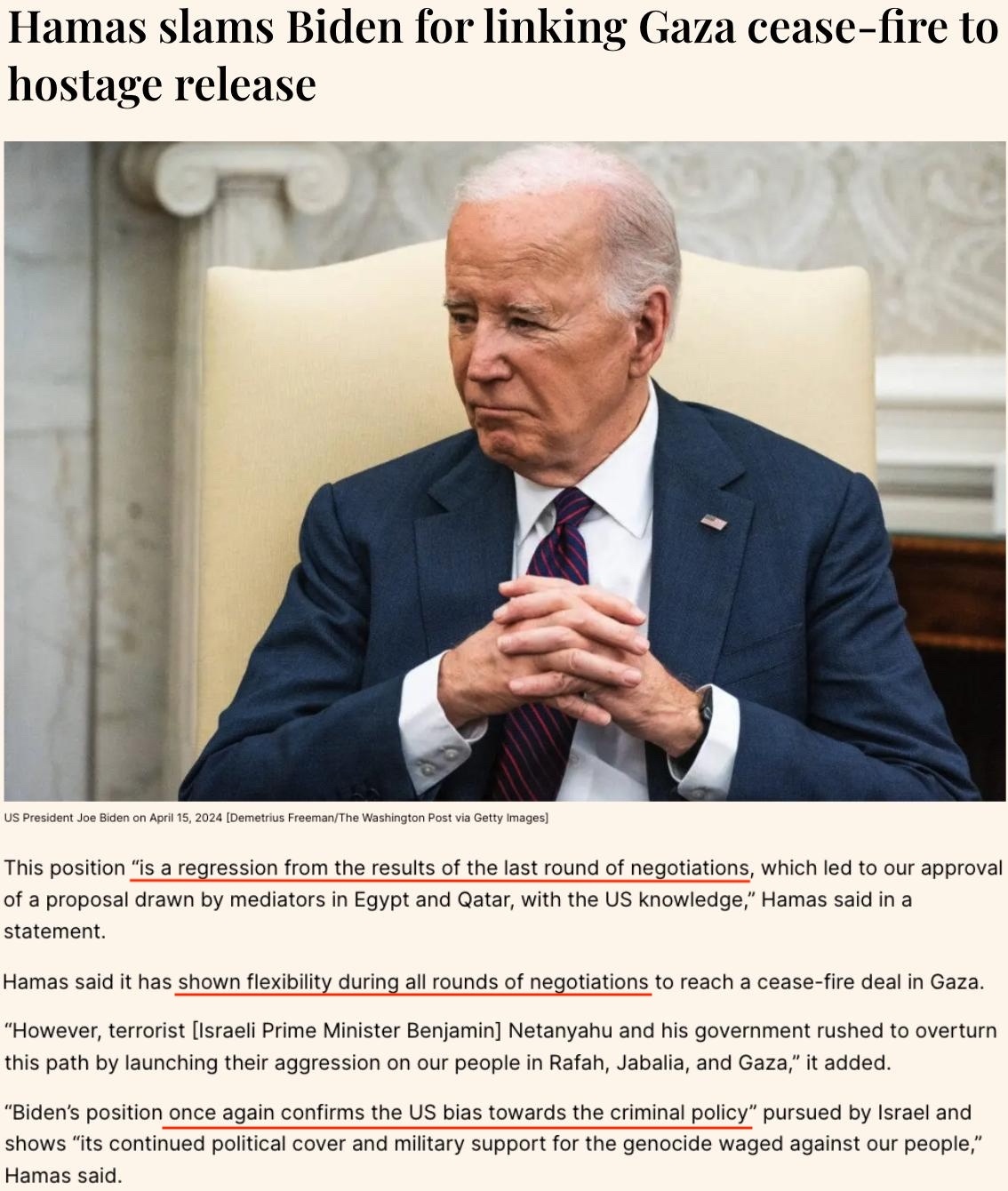 “拜登的言論令停火談判進(jìn)程倒退,也再次證明了美國(guó)對(duì)以色列的偏袒”。