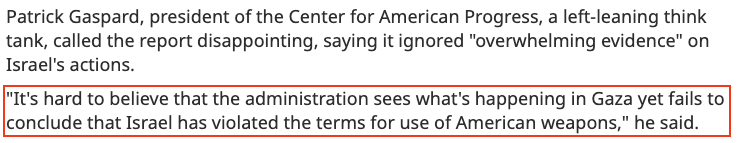 “報(bào)告中確實(shí)說,可以合理認(rèn)定以色列在違反國(guó)際人道主義法的行動(dòng)中使用了美制武器,但報(bào)告卻不明確說以色列違反了國(guó)際人道主義法?!?/p>