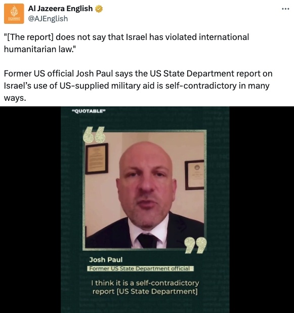 因不滿拜登政府巴以政策而于去年10月辭職的美國(guó)國(guó)務(wù)院政治軍事事務(wù)局前主任喬希·保羅認(rèn)為,這是一份自相矛盾的報(bào)告,沒有從所確定的事實(shí)中得出合乎邏輯的結(jié)論。