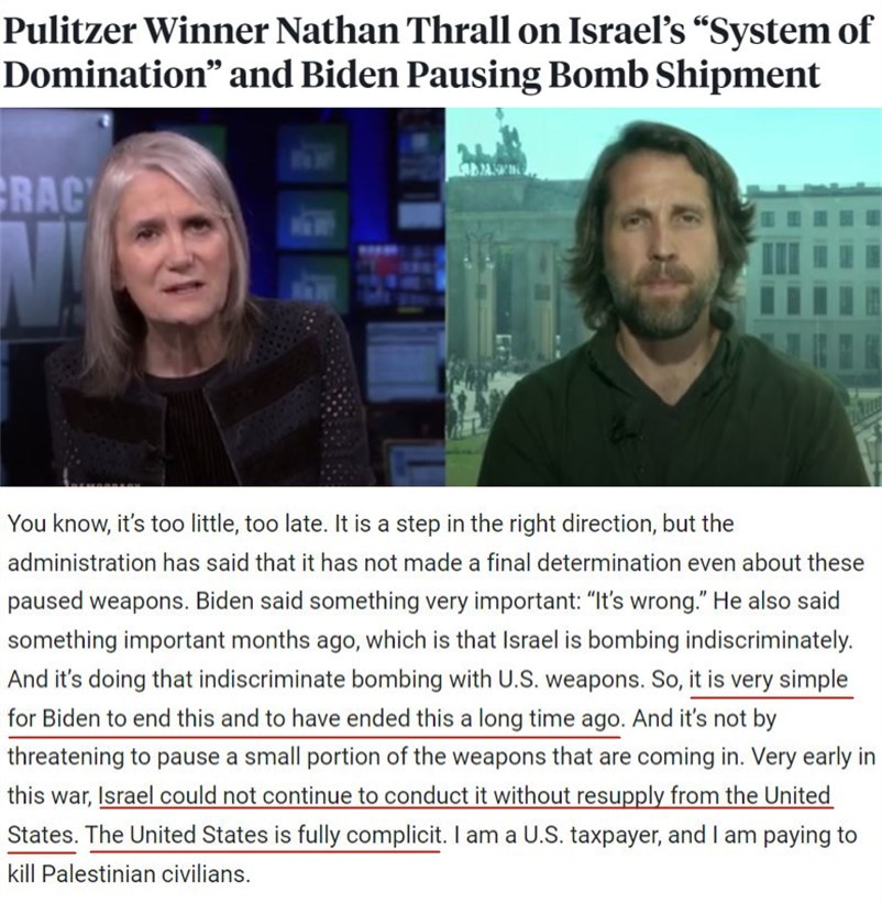 對(duì)此,常駐耶路撒冷的美國(guó)記者兼知名作家內(nèi)森·薩爾一針見血地指出,對(duì)于拜登來說,結(jié)束這一切其實(shí)很簡(jiǎn)單,而且早該結(jié)束了,不必像現(xiàn)在這樣通過威脅暫停供應(yīng)一小部分武器來實(shí)現(xiàn)。