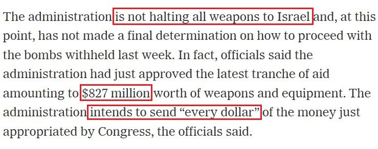 事實(shí)上,就在暫停向以色列運(yùn)送重型炸彈的同時(shí),拜登政府剛剛批準(zhǔn)了最新一批價(jià)值8.27億美元的對(duì)以軍事裝備援助。用美國(guó)官員們的話說,拜登政府打算把最新對(duì)以援助撥款的“每一美元”都用出去。