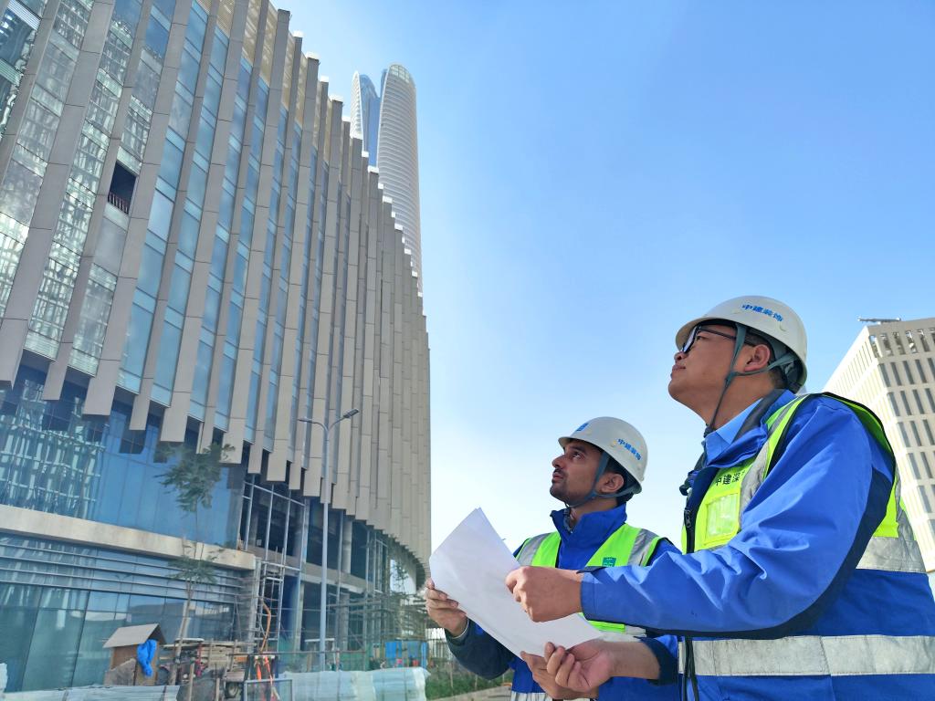 2023年11月27日,中建深圳裝飾有限公司項目經(jīng)理徐笑笑(右)與來自埃及的幕墻工程師艾哈邁德·賽義德在埃及開羅以東的埃及新行政首都中央商務(wù)區(qū)施工現(xiàn)場一同查看幕墻安裝進(jìn)度(手機(jī)拍攝)。新華社發(fā)(中建深圳裝飾有限公司供圖)