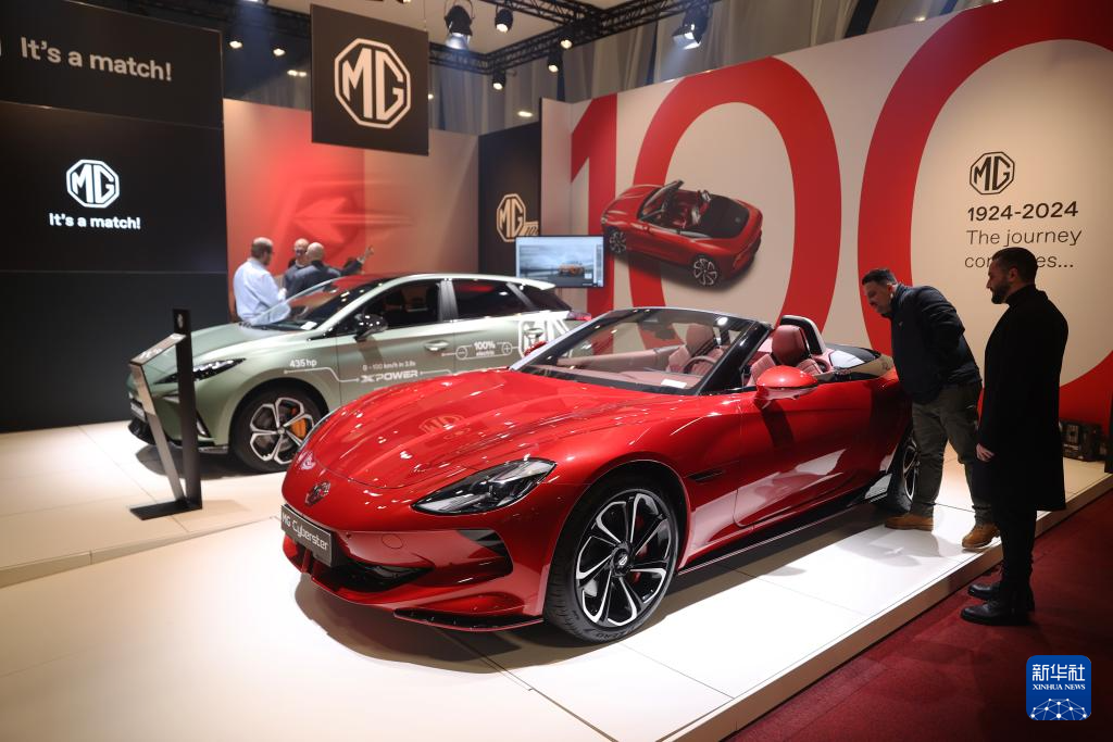 2024年1月17日,人們?cè)诒壤麜r(shí)布魯塞爾舉辦的2024布魯塞爾汽車(chē)展上參觀(guān)上汽名爵電動(dòng)汽車(chē)。新華社記者 趙丁喆 攝