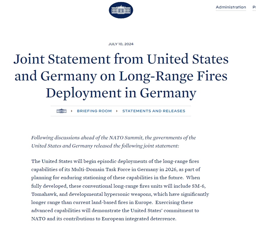 在上周的北約華盛頓峰會期間,美國和德國聯(lián)合宣布,作為長期規(guī)劃的一部分,美國將從2026年開始分階段在德國部署遠(yuǎn)程武器。
