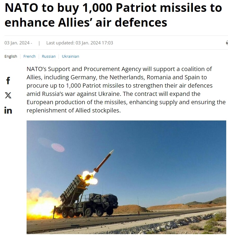 包括德國、荷蘭、羅馬尼亞和西班牙在內(nèi)的北約多個歐洲成員國今年1月決定聯(lián)合采購總價(jià)值55億美元的1000枚“愛國者”導(dǎo)彈,以幫助加強(qiáng)烏克蘭軍隊(duì)的防空能力,并補(bǔ)充北約各援烏國家的庫存。