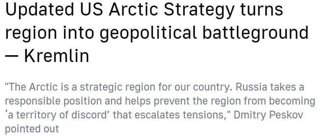 在被問及對美國這份北極戰(zhàn)略報告的看法時,俄羅斯總統(tǒng)新聞秘書佩斯科夫指出,美方報告顯示出對抗色彩,而俄羅斯一直在北極問題上采取負責任的立場,"為確保北極不會成為紛爭和局勢緊張地區(qū)做出貢獻"。