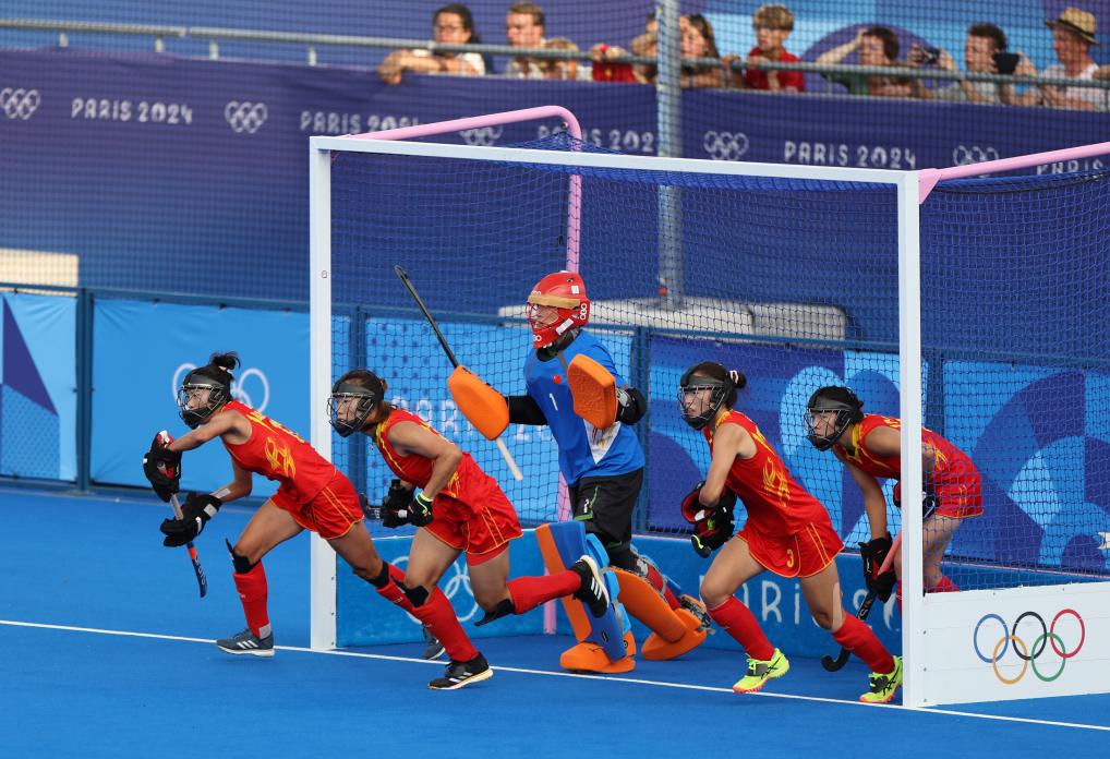 8月7日,中國(guó)女子曲棍球隊(duì)球員在比賽中防守短角球。新華社記者 任鵬飛 攝