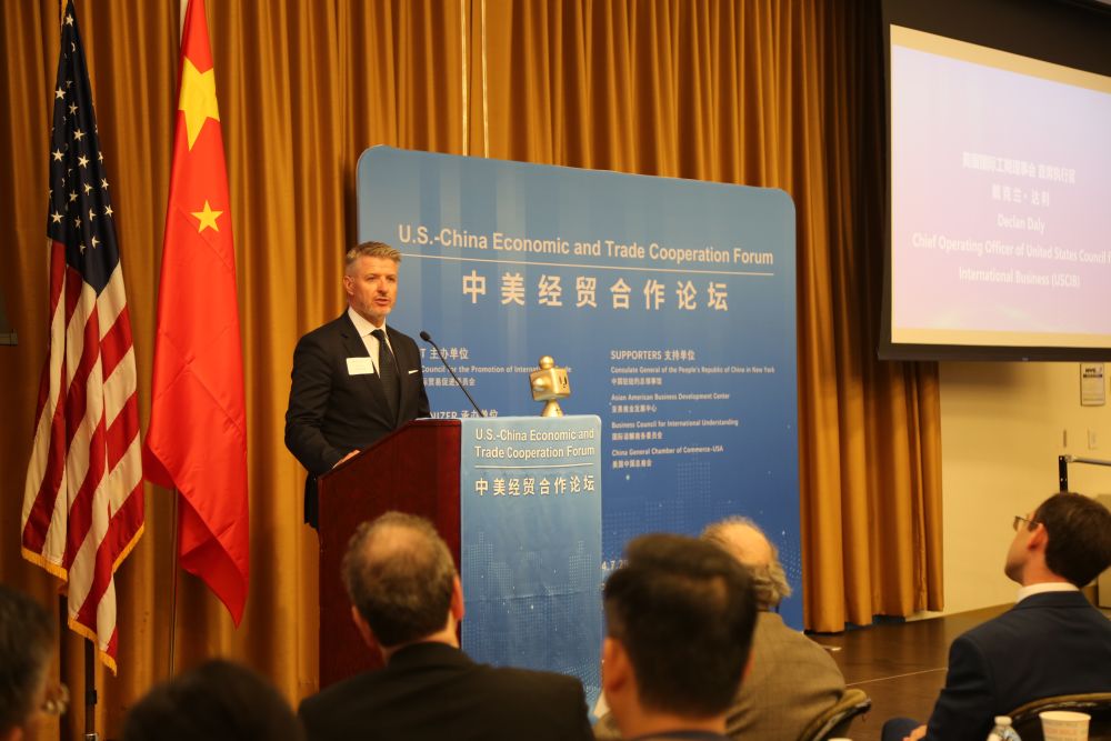 7月29日,在美國(guó)紐約,美國(guó)國(guó)際工商理事會(huì)首席運(yùn)營(yíng)官戴克蘭·達(dá)利在中國(guó)—美國(guó)經(jīng)貿(mào)合作論壇上致辭。中國(guó)—美國(guó)經(jīng)貿(mào)合作論壇29日在紐約市舉行,300余位中美企業(yè)及商協(xié)會(huì)代表出席。新華社記者劉亞南攝