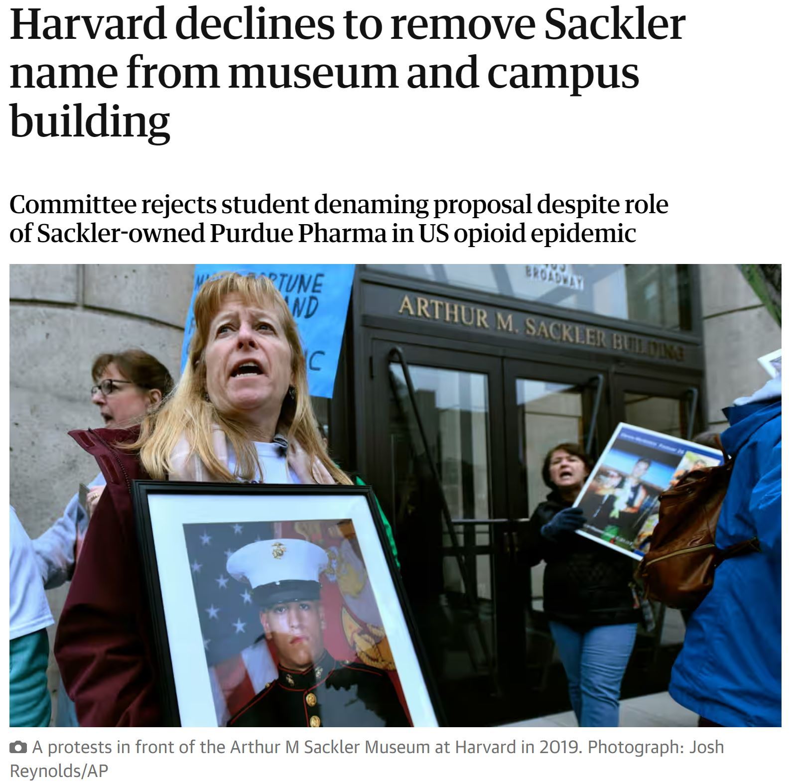 近日,美國哈佛大學拒絕了部分學生及有關方面提出的將“薩克勒”這一名字從哈佛大學博物館及其他校內建筑上去除的要求,再次引發(fā)了人們對美國藥物成癮問題的關注。