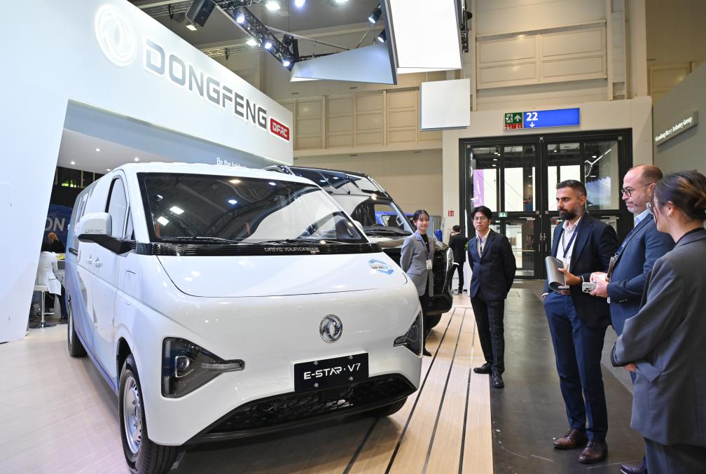 9月16日,在德國(guó)漢諾威國(guó)際交通運(yùn)輸博覽會(huì)媒體預(yù)展上,人們?cè)跂|風(fēng)汽車展區(qū)參觀E-STAR V7商用車。新華社記者任鵬飛攝
