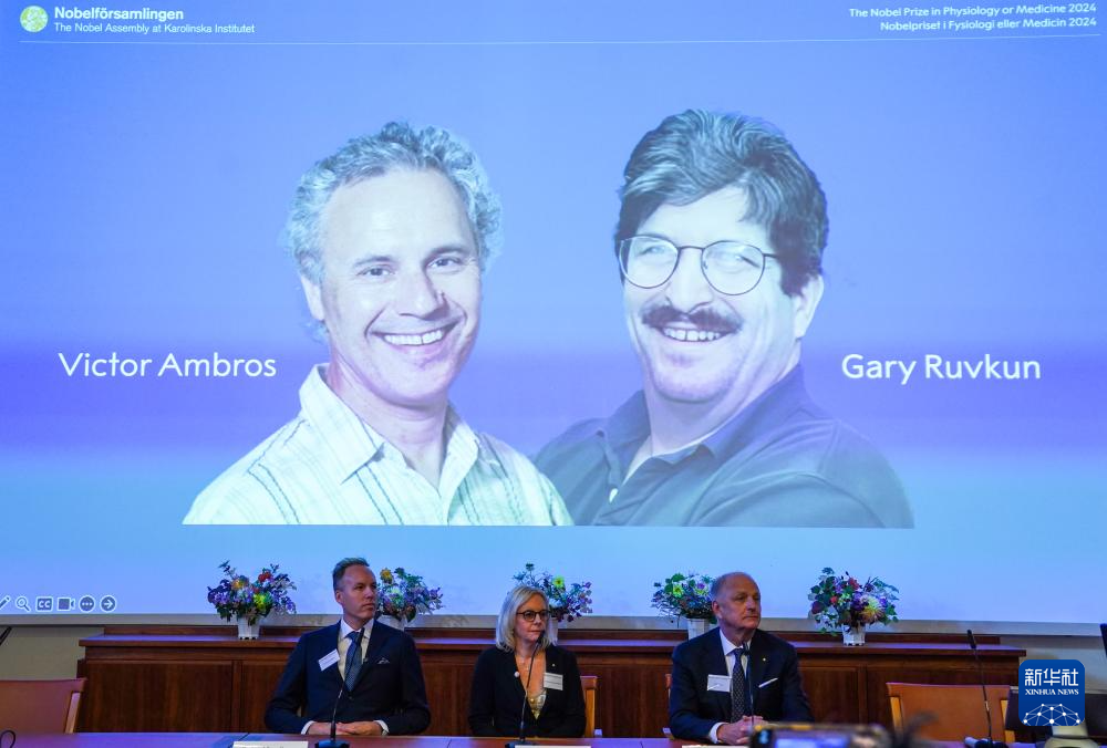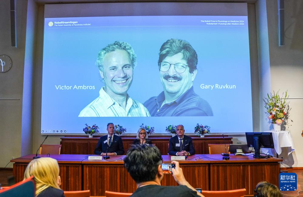 10月7日,在瑞典斯德哥爾摩舉行的2024年諾貝爾生理學(xué)或醫(yī)學(xué)獎(jiǎng)公布現(xiàn)場(chǎng),屏幕顯示獎(jiǎng)項(xiàng)得主美國(guó)科學(xué)家維克托·安布羅斯(左)和加里·魯夫坎的照片。新華社記者 彭子洋 攝