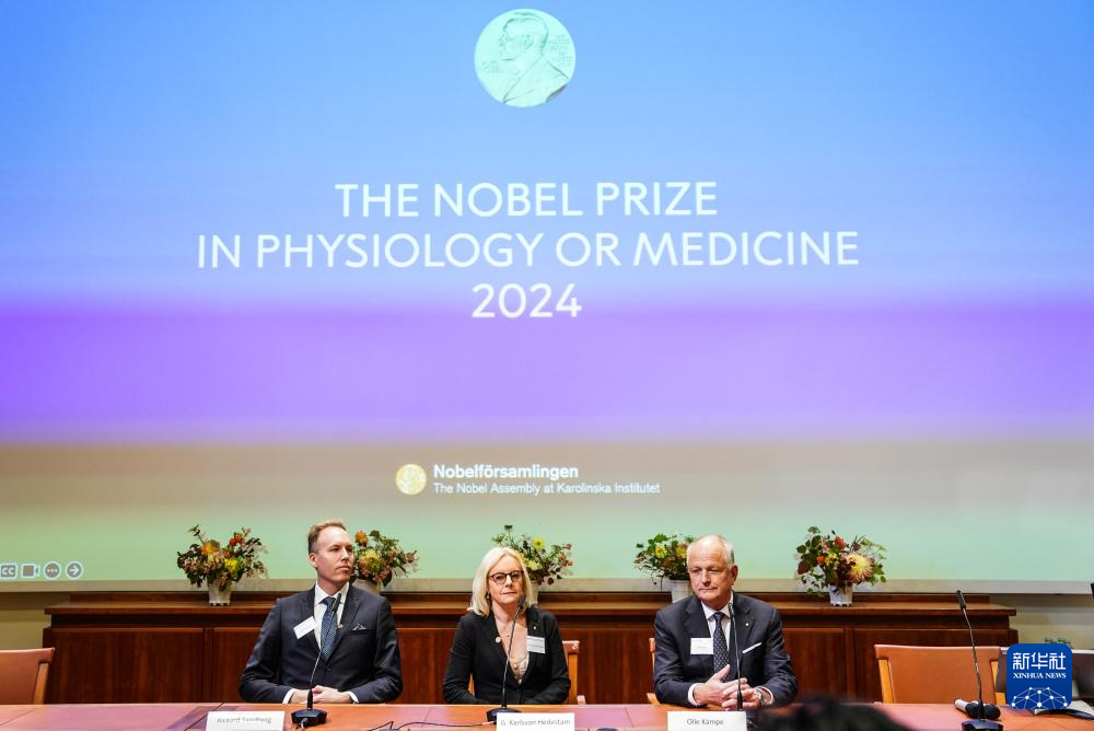 這是10月7日在瑞典斯德哥爾摩拍攝的2024年諾貝爾生理學(xué)或醫(yī)學(xué)獎(jiǎng)公布現(xiàn)場(chǎng)。新華社記者 彭子洋 攝