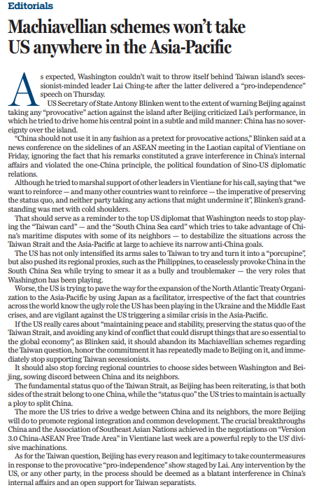美國國務(wù)卿布林肯11日在萬象舉行記者會表示,中國不應(yīng)以賴清德“雙十”講話為借口采取“挑釁行動”。布林肯大放厥詞,嚴(yán)重干涉中國內(nèi)政,違反一個中國原則,而該原則正是中美關(guān)系的政治基礎(chǔ)。