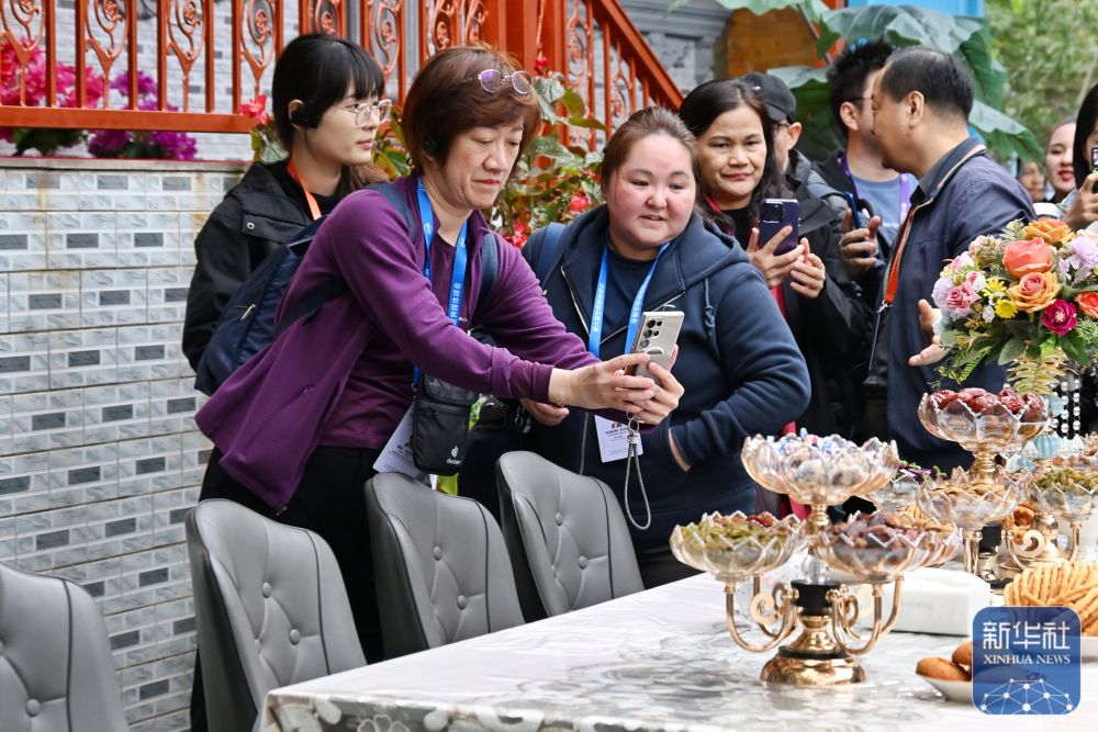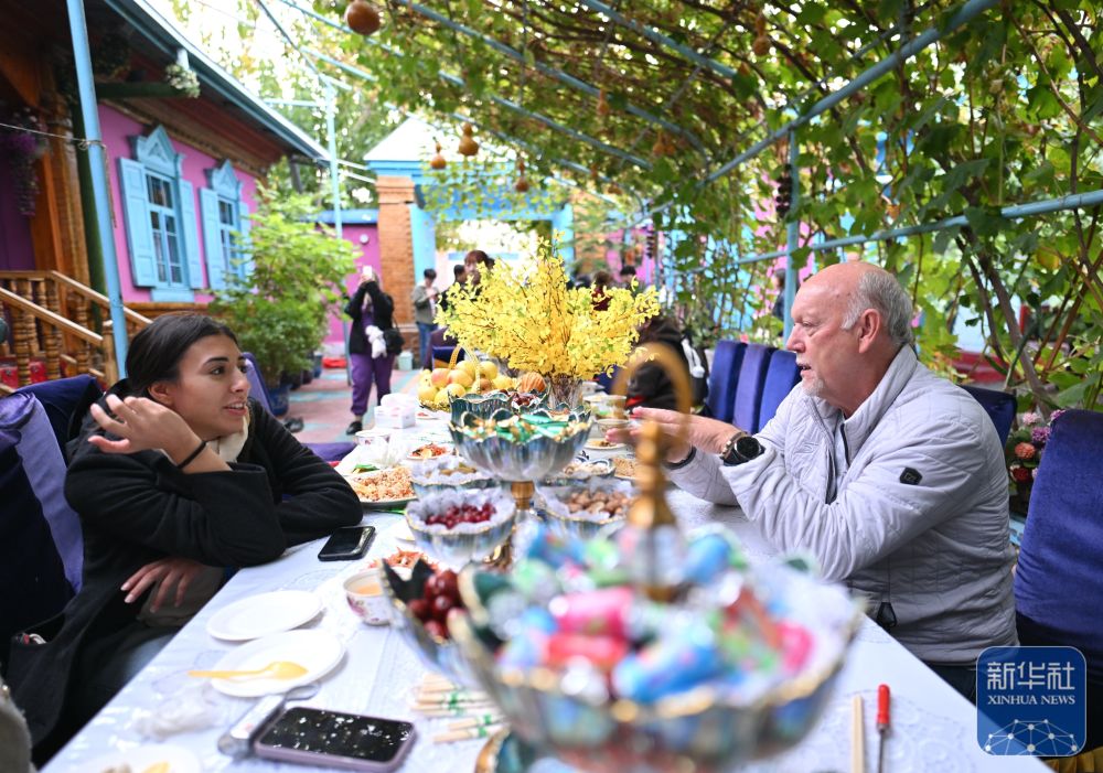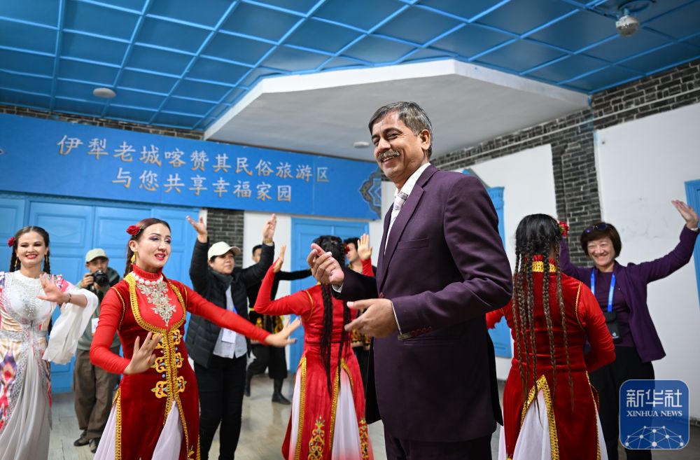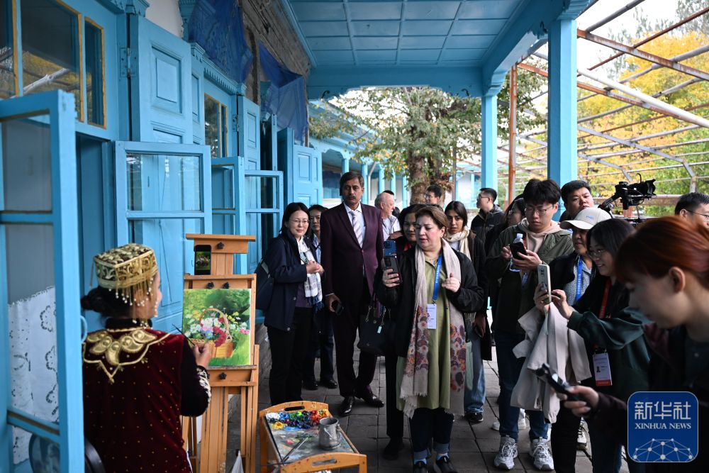 10月15日,與會嘉賓在伊寧市喀贊其民俗旅游區(qū)參訪。 新華社記者 李響 攝