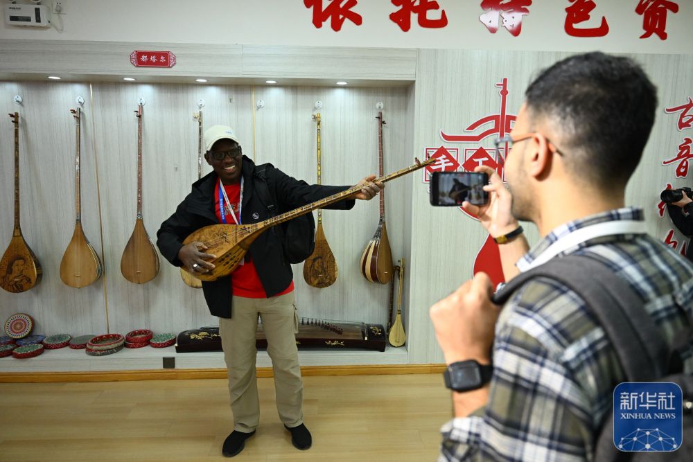10月15日,與會嘉賓在阿克蘇地區(qū)新和縣加依村加依手工樂器產(chǎn)業(yè)園體驗傳統(tǒng)樂器。 新華社記者 劉夢琪 攝