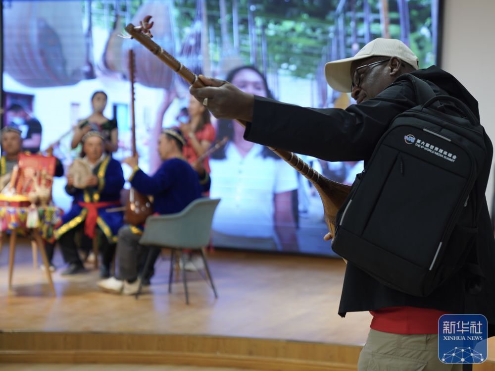 10月15日,與會嘉賓在阿克蘇地區(qū)新和縣加依村龜茲文化樂器展示中心與演員互動。 新華社記者 陳朔 攝