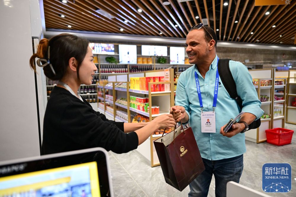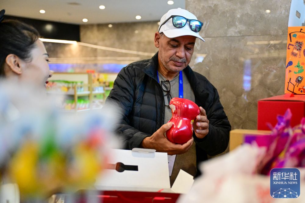 10月15日,與會嘉賓在新疆喀什跨境電商進出口商品展示交易中心購買紀(jì)念品。 新華社記者 丁磊 攝
