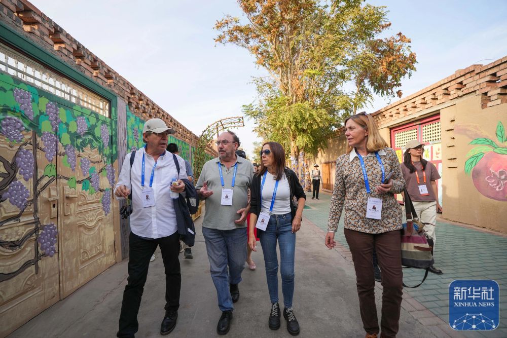 10月15日,與會嘉賓在吐魯番市高昌區(qū)亞爾鎮(zhèn)新城片區(qū)新城西門村參訪。 新華社記者 陳曄華 攝