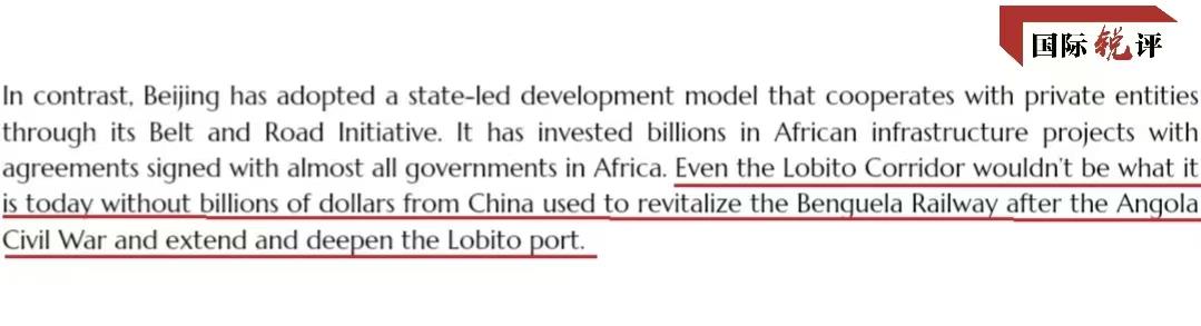 黎文濤認(rèn)為,美國(guó)試圖把“洛比托走廊”包裝成美歐為非洲基建作出的貢獻(xiàn),完全不符合事實(shí)。因?yàn)樗暮诵墓羌苤袊?guó)早已搭好,中國(guó)才是名副其實(shí)的最大貢獻(xiàn)者?!奥灞韧凶呃取惫倬W(wǎng)上也有這樣一段話:“如果沒有中國(guó)投入數(shù)十億美元重建本格拉鐵路、擴(kuò)建洛比托港口,‘洛比托走廊’就沒有當(dāng)今的模樣。”