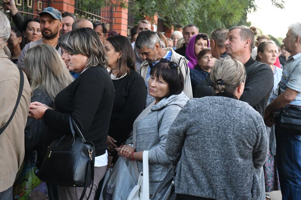 8月13日,在俄羅斯庫(kù)爾斯克市,來(lái)自俄烏邊境地區(qū)的居民排隊(duì)領(lǐng)取救援物資。新華社發(fā)