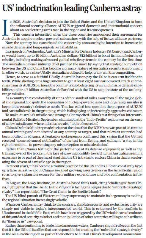 作為一個(gè)遠(yuǎn)離全球和地區(qū)主要熱點(diǎn)的國家,購買核動(dòng)力潛艇和遠(yuǎn)程導(dǎo)彈超出了澳大利亞的防御需要。這不禁令人對(duì)“奧庫斯”的目的以及澳大利亞在其中的作用產(chǎn)生疑問,因?yàn)椤皧W庫斯”表現(xiàn)出越來越強(qiáng)的攻擊性。