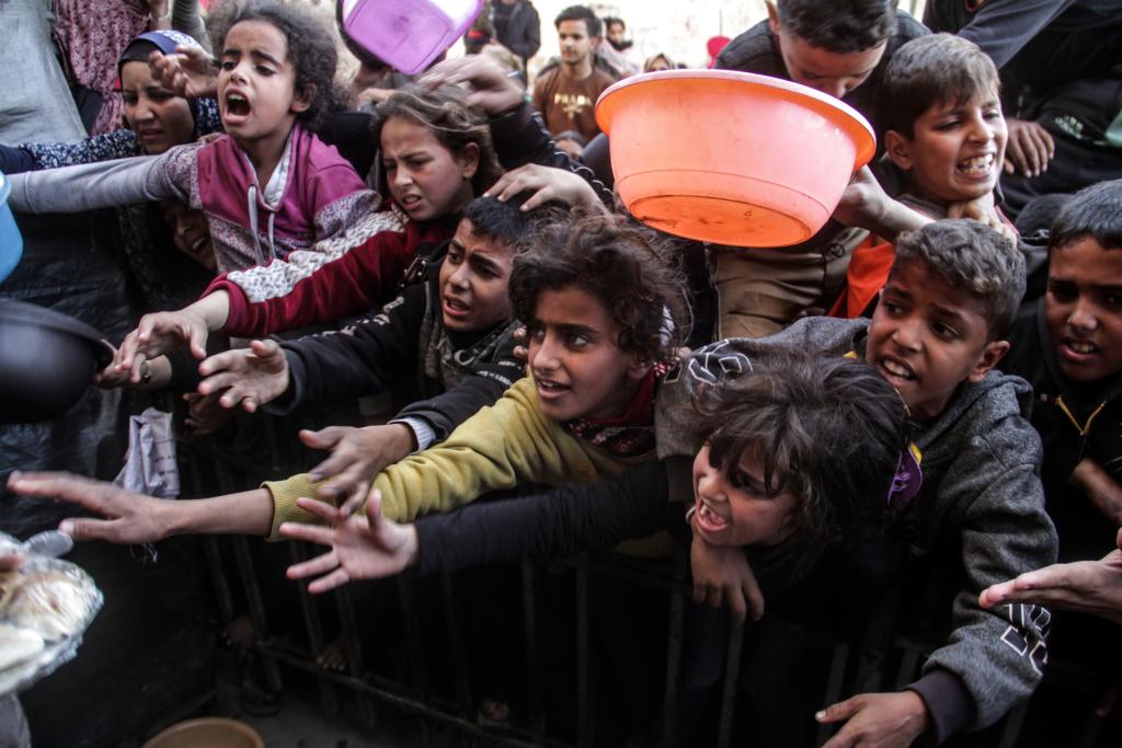 12月23日,巴勒斯坦兒童在加沙城領(lǐng)取食物。新華社發(fā)(馬哈茂德·扎基攝)