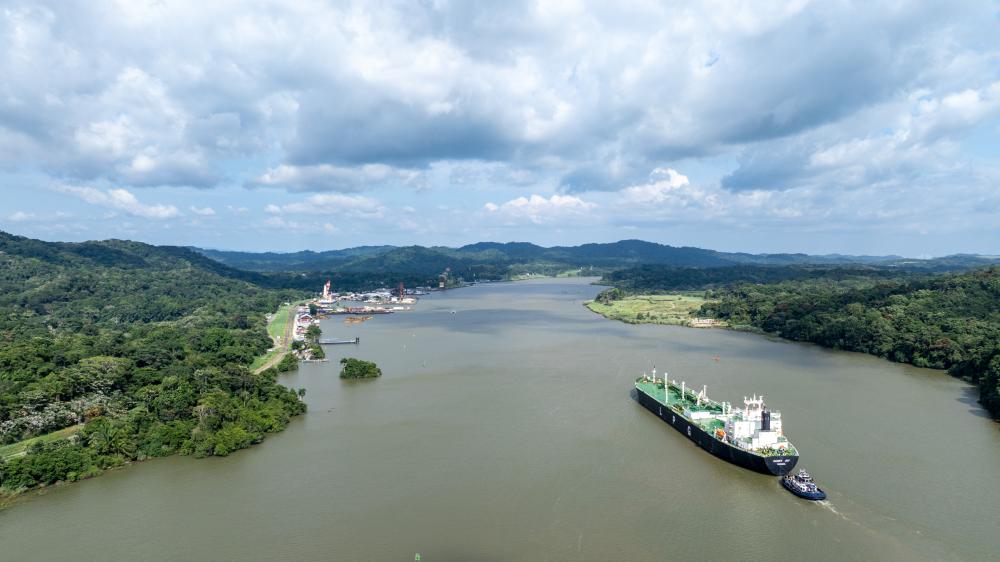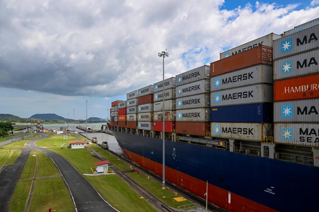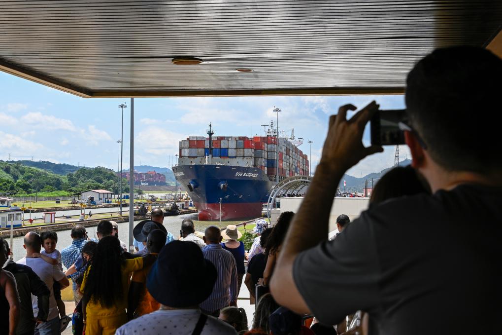 8月28日,在巴拿馬首都巴拿馬城附近,一艘貨輪通過(guò)巴拿馬運(yùn)河的米拉弗洛雷斯船閘準(zhǔn)備駛?cè)胩窖?。新華社記者李木子攝