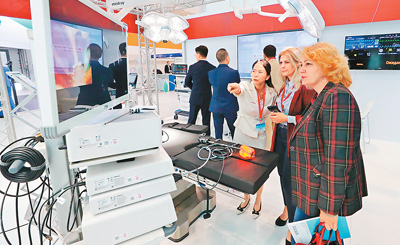 觀眾在白俄羅斯中白工業(yè)園舉行的2024中國醫(yī)學(xué)裝備(白俄羅斯)展覽會(huì)上參觀。 任科夫攝(新華社發(fā))