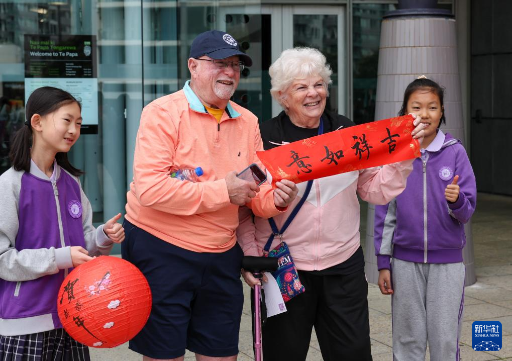 2月1日,在新西蘭首都惠靈頓,當(dāng)?shù)鼐用裨诙嘣逡嵯灿瓪g樂春節(jié)活動中展示中國書法作品。新華社發(fā)(孟韜攝)