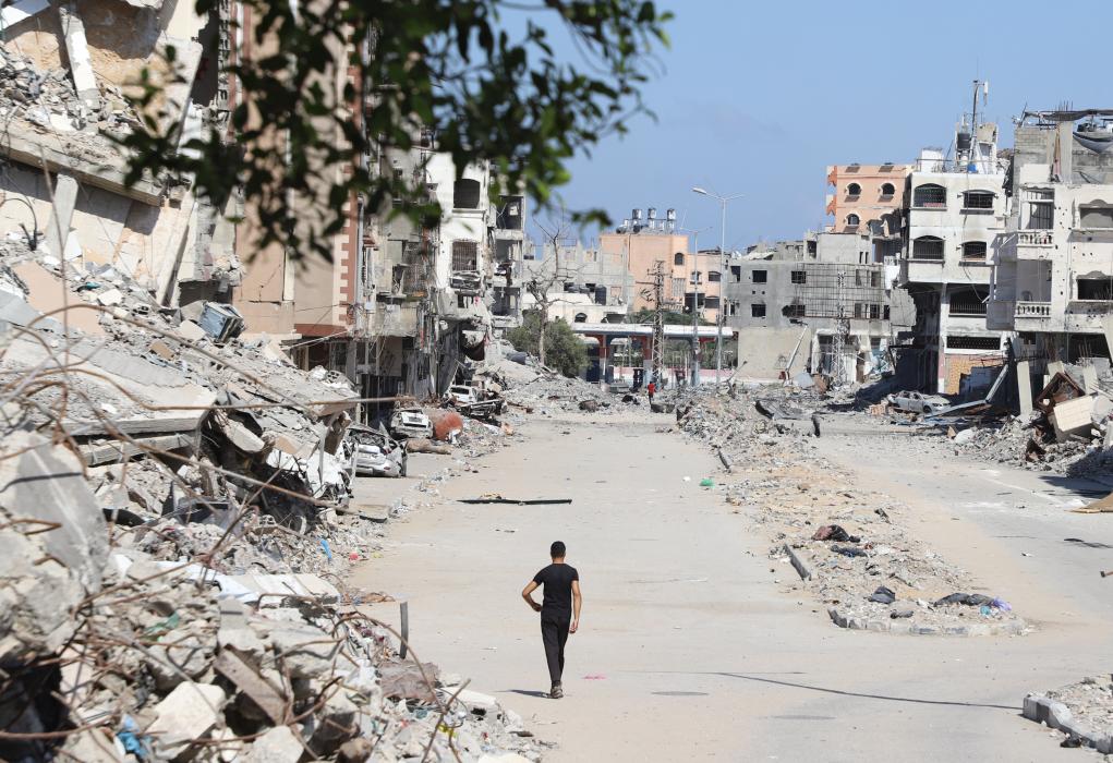 2024年10月9日,在加沙地帶北部杰巴利耶,一名男子從建筑廢墟旁走過。新華社發(fā)(阿卜杜勒拉赫曼·薩拉馬攝)