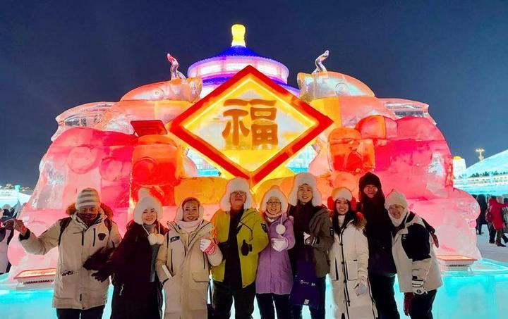2月1日,馬來西亞游客陳新全(右四)在黑龍江省哈爾濱冰雪大世界游玩時與旅行團(tuán)友合影(受訪者提供)。