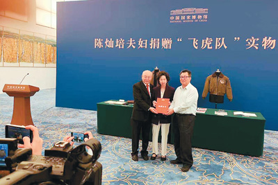 陳燦培夫婦(左一、左二)向中國國家博物館捐贈飛虎隊文物?! ∈茉L者供圖