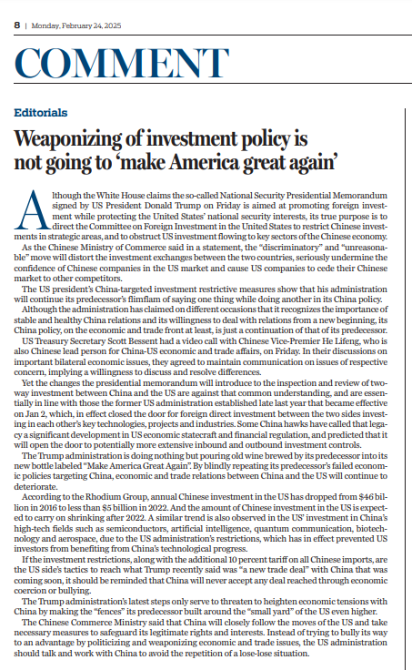 上周五(2月21日),美國總統(tǒng)特朗普簽署所謂的“國家安全總統(tǒng)備忘錄”(下稱“備忘錄”)。白宮稱,該備忘錄旨在鼓勵外來投資的同時,保護美國國家安全利益。然而,其真實目的是責令美國外國投資委員會限制中國對美國關(guān)鍵領(lǐng)域投資,并妨礙美國對中國關(guān)鍵領(lǐng)域投資。