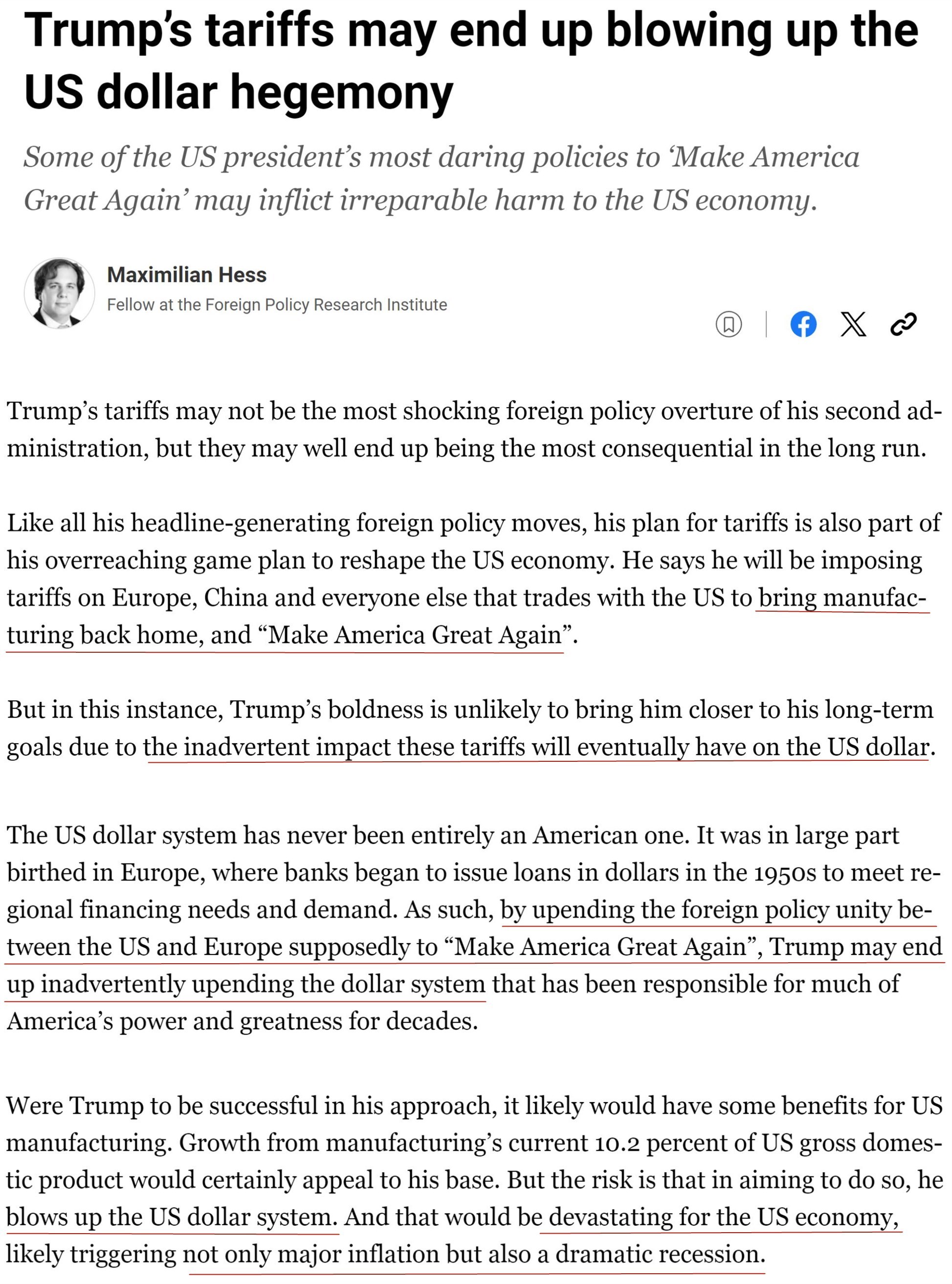 文章指出,一直以來,全球?qū)γ涝男枨笫蛊涑蔀槊绹闹饕隹诋a(chǎn)品。正是這種“過分的特權(quán)”使美國能夠在不對經(jīng)濟造成重大負擔(dān)的情況下長期維持貿(mào)易和財政赤字。而如今特朗普政府的關(guān)稅政策可能最終摧毀美元霸權(quán),從而使美國經(jīng)濟遭到毀滅性打擊。