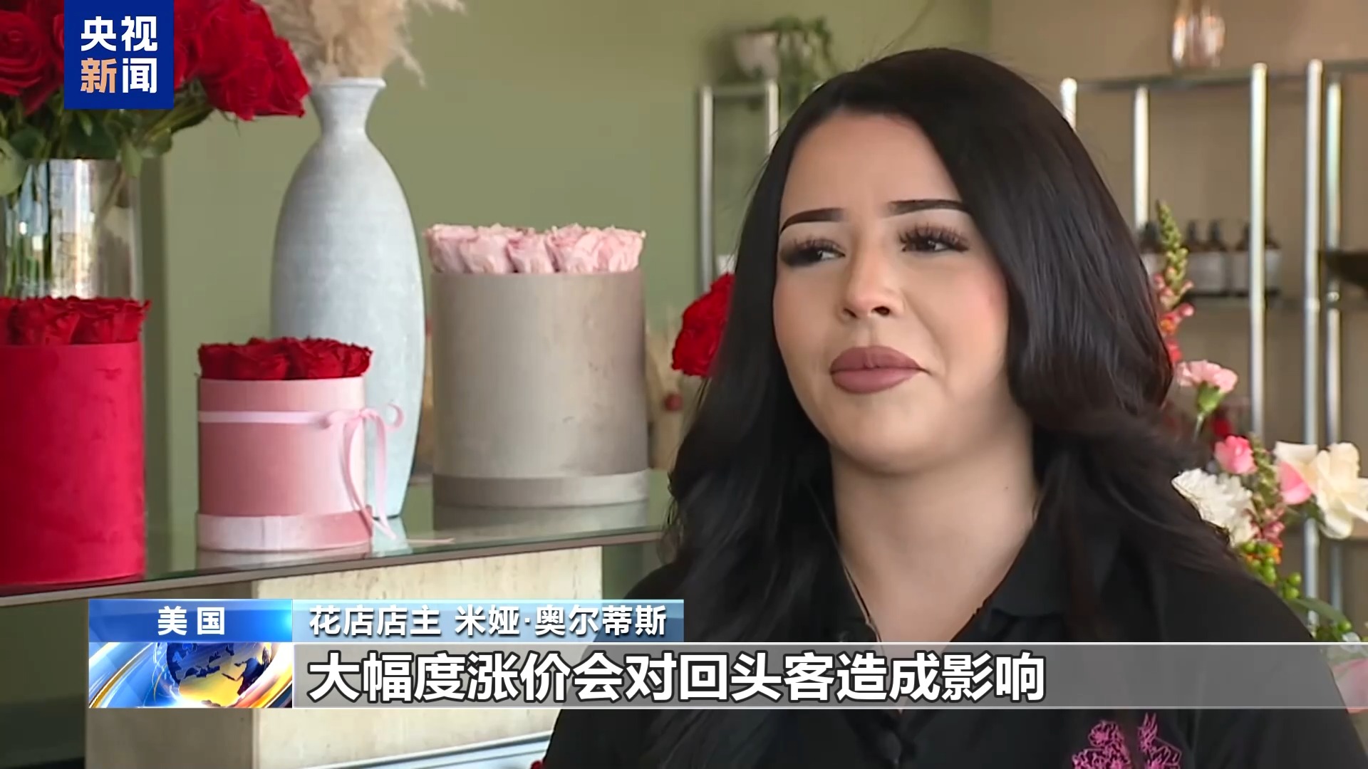 花店店主 米婭·奧爾蒂斯:關(guān)稅政策正在傷害像我家這樣的小企業(yè),我們的玫瑰是厄瓜多爾進(jìn)口的。