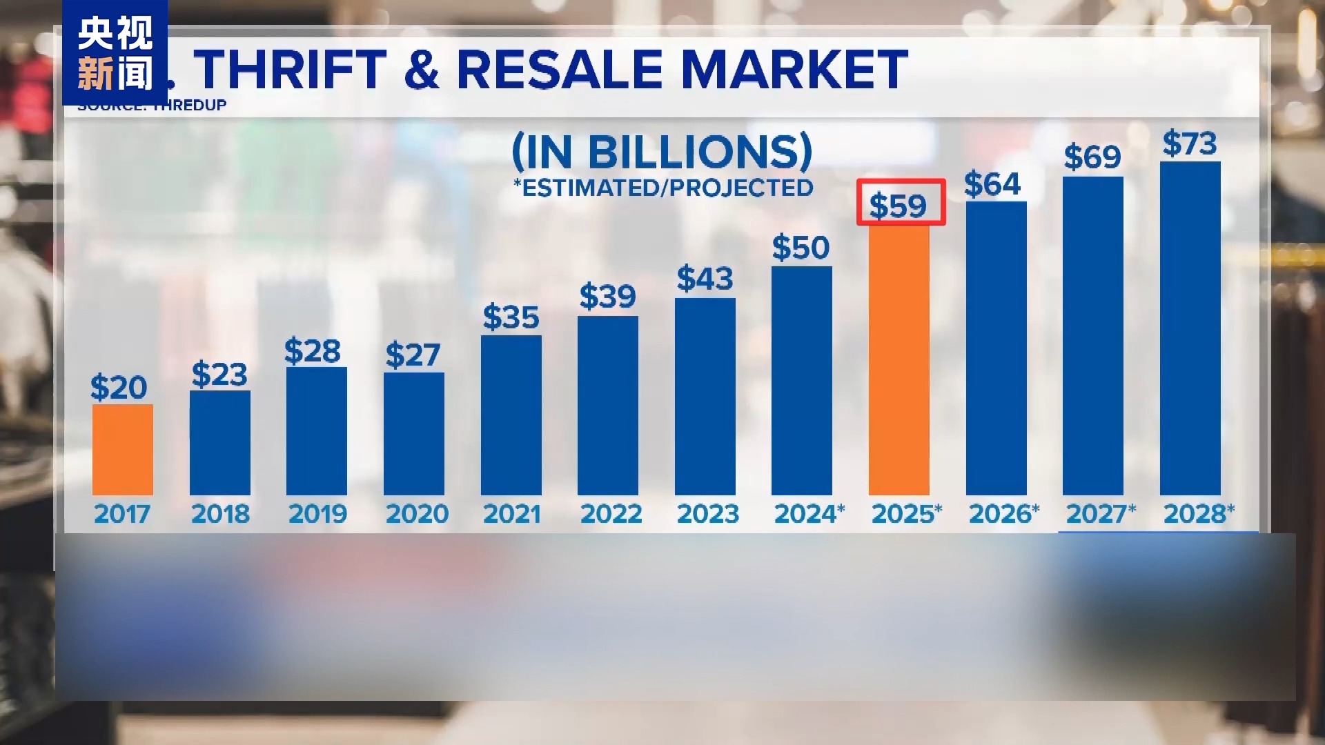 美國(guó)二手商品交易在線平臺(tái)思雷達(dá)普公司的數(shù)據(jù)顯示,2017年美國(guó)二手交易市場(chǎng)的價(jià)值只有200億美元。根據(jù)該公司的預(yù)測(cè),受關(guān)稅政策影響,2025年二手交易市場(chǎng)價(jià)值將升至590億美元,此后也將一路飆升,照此發(fā)展2028年的價(jià)值將達(dá)到730億美元。