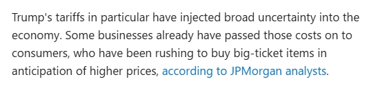 商界領(lǐng)袖們迫切希望美國的政策能有幾周的穩(wěn)定,美國農(nóng)戶們發(fā)現(xiàn)自己的聯(lián)邦食品補貼合同已經(jīng)終止,全美各地的非營利組織都在裁員,因為白宮正在削減開支。尤其是特朗普政府的關(guān)稅政策給經(jīng)濟帶來了廣泛的不確定性。摩根大通分析師表示,一些企業(yè)已經(jīng)將這些成本轉(zhuǎn)嫁給了消費者,消費者因預期價格上漲而搶購大件商品。