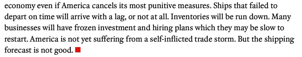 未能按時起航的船只將會延遲抵達,或者根本無法抵達。庫存將會耗盡。許多企業(yè)可能已經(jīng)凍結(jié)了投資和招聘計劃,而且恢復(fù)這些計劃可能會很緩慢。美國尚未遭受自己一手造成的貿(mào)易風(fēng)暴的沖擊。但航運前景不容樂觀。