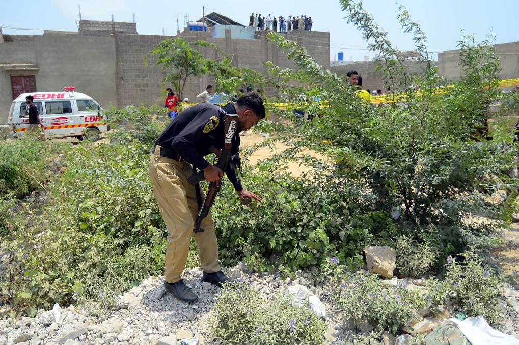 2025年5月8日,在巴基斯坦卡拉奇,安全人員檢查印度無(wú)人機(jī)襲擊現(xiàn)場(chǎng)附近區(qū)域。新華社發(fā)