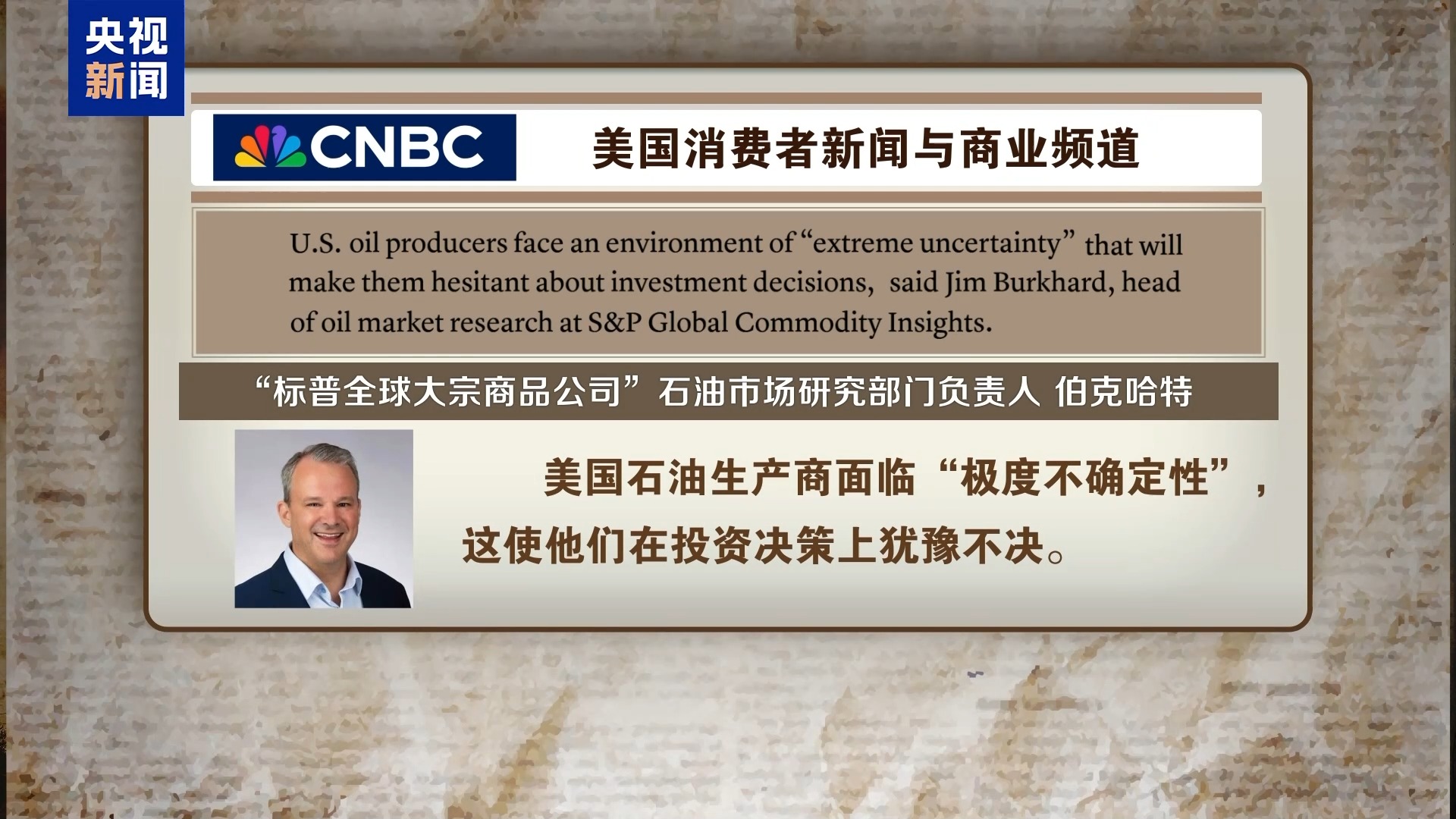 美國消費者新聞與商業(yè)頻道援引“標(biāo)普全球大宗商品公司”石油市場研究部門負(fù)責(zé)人伯克哈特的話報道稱,美國石油生產(chǎn)商面臨“極度不確定性”,這使他們在投資決策上猶豫不決。