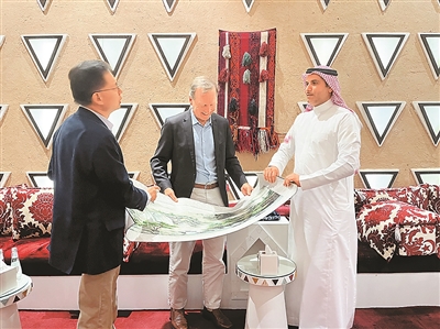 尼爾·布什(中)與Skytower Investments首席執(zhí)行官方洪(左),向沙特阿拉伯國家工業(yè)發(fā)展與物流計(jì)劃署首席執(zhí)行官蘇萊曼·本·哈立德·馬茲魯阿(右)贈送中國絲綢畫卷。