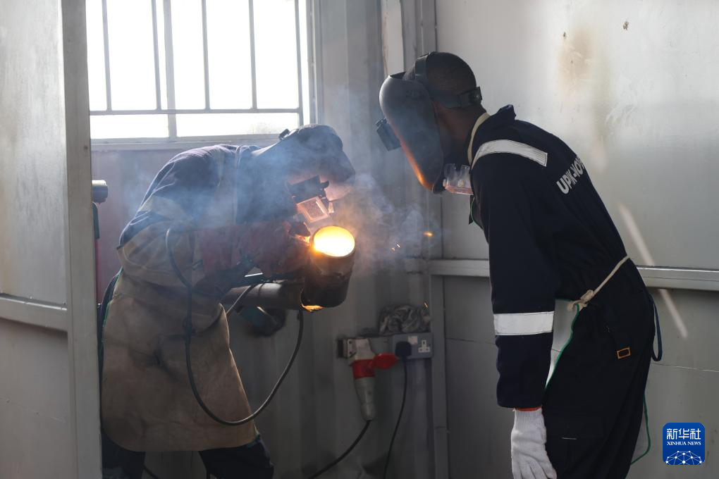 6月16日,在烏干達(dá)基貢巴石油學(xué)院,兩名學(xué)員在焊接工位進(jìn)行練習(xí)。新華社發(fā)(中石化供圖)