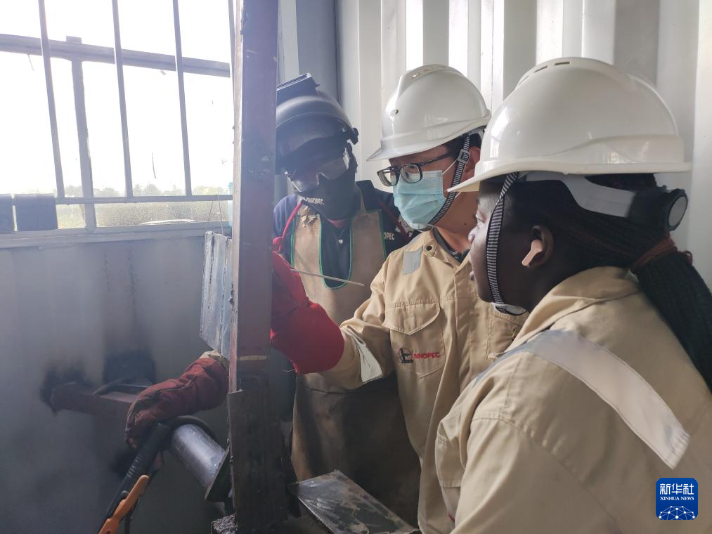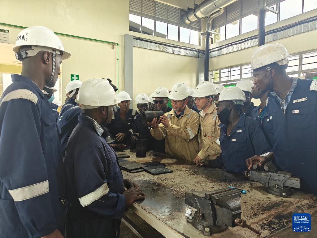 6月11日,在烏干達(dá)基貢巴石油學(xué)院,中國(guó)老師湯海東(中)為學(xué)員講解焊接要點(diǎn)。新華社發(fā)(中石化供圖)