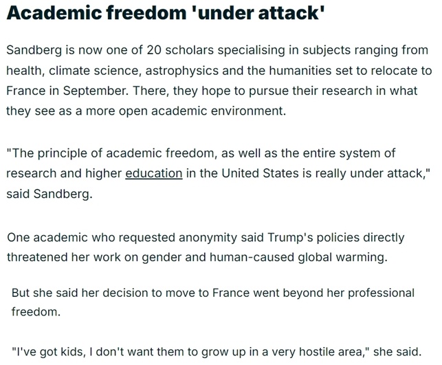 還有一位女學(xué)者告訴媒體,美國現(xiàn)政府的政策直接威脅到她有關(guān)氣候變暖等方面的研究工作,她搬到法國不僅是為了學(xué)術(shù)自由,還是因?yàn)椴幌胱屪约旱暮⒆印霸谝粋€充滿敵意的地方長大”。