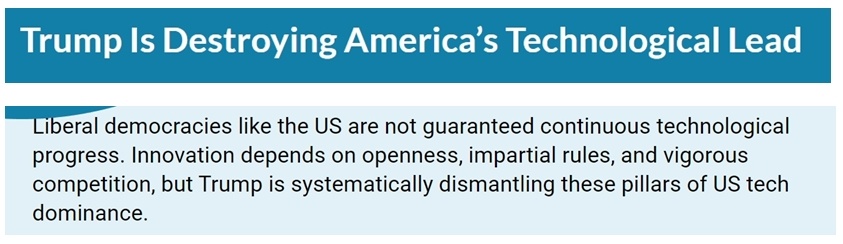 文章稱,研究機(jī)構(gòu)、人才、資金等一直是支撐美國創(chuàng)新發(fā)展的重要支柱,而美國現(xiàn)政府正在系統(tǒng)性地拆除這些支柱,斷送自己的科技領(lǐng)先地位。